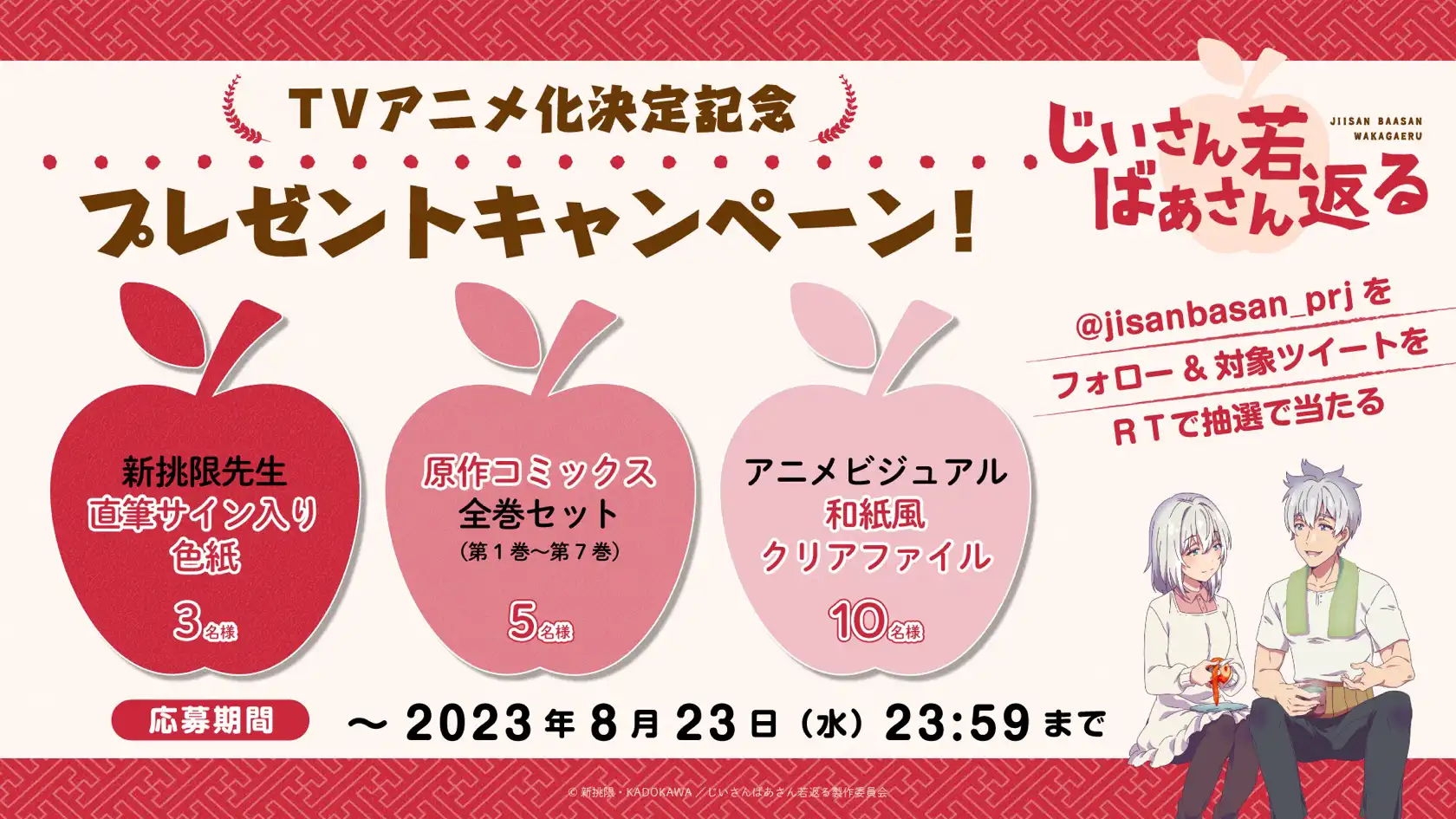 TVアニメ化を記念して、TVアニメ「じいさんばあさん若返る」公式Twitterにてプレゼントキャンペーン実施! このキャンペーンだけの豪華賞品をどうぞお見逃しなく!