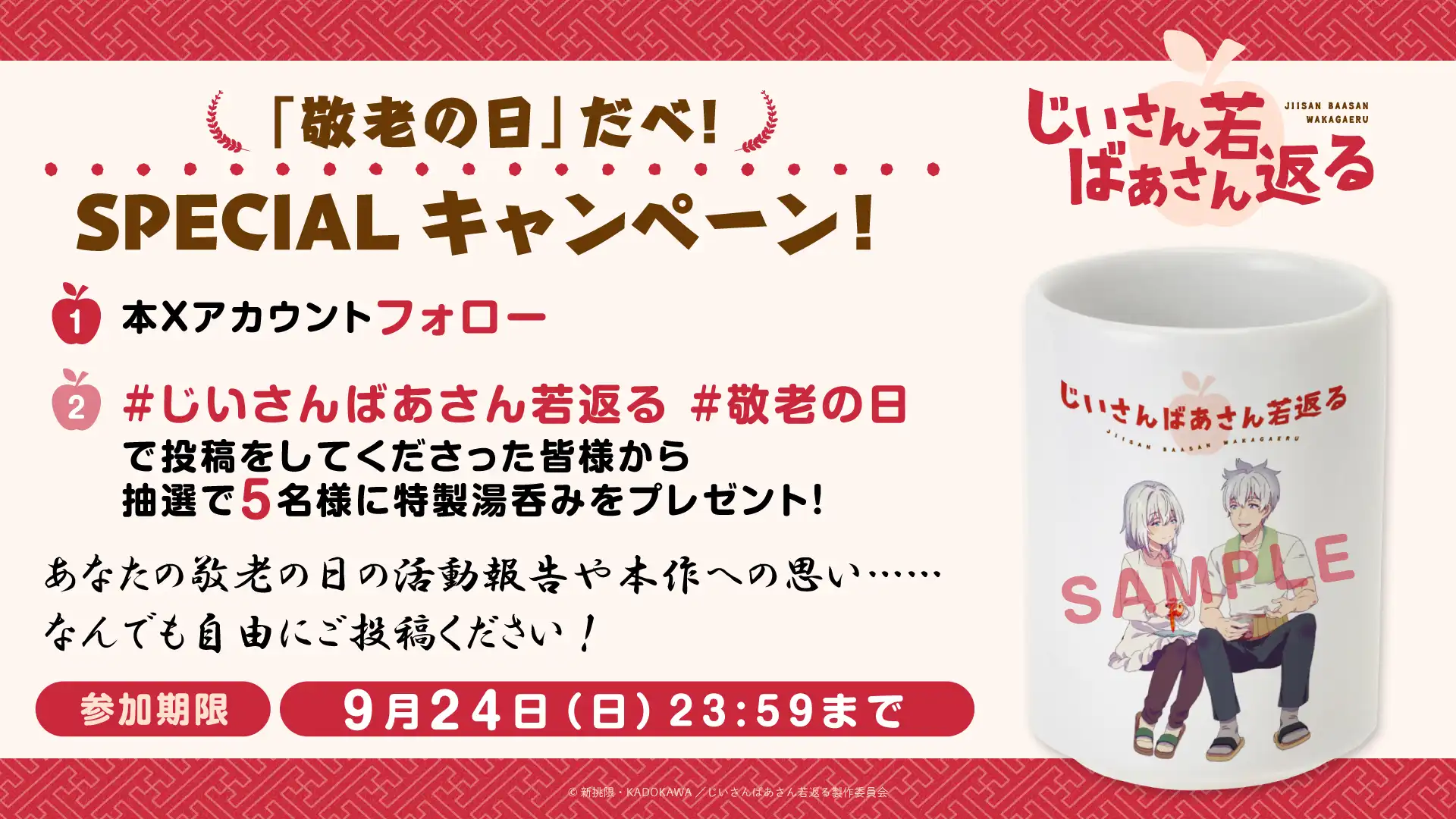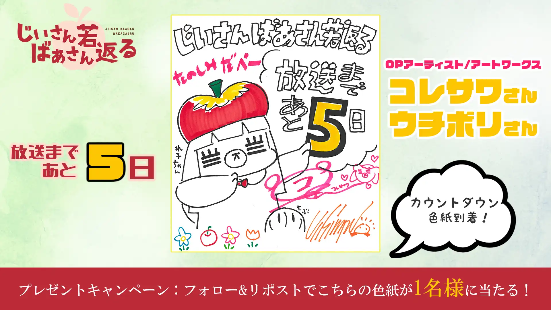 『じいさんばあさん若返る』の第5話放送を記念して、感想投稿キャンペーンを実施! 『じいさんばあさん若返る』TVアニメ公式X(@jisanbasan_prj)をフォロー&感想を「#じいさんばあさん若返る」をつけてツイートすると、抽選でサイン入りポスターを1名様にプレゼント!