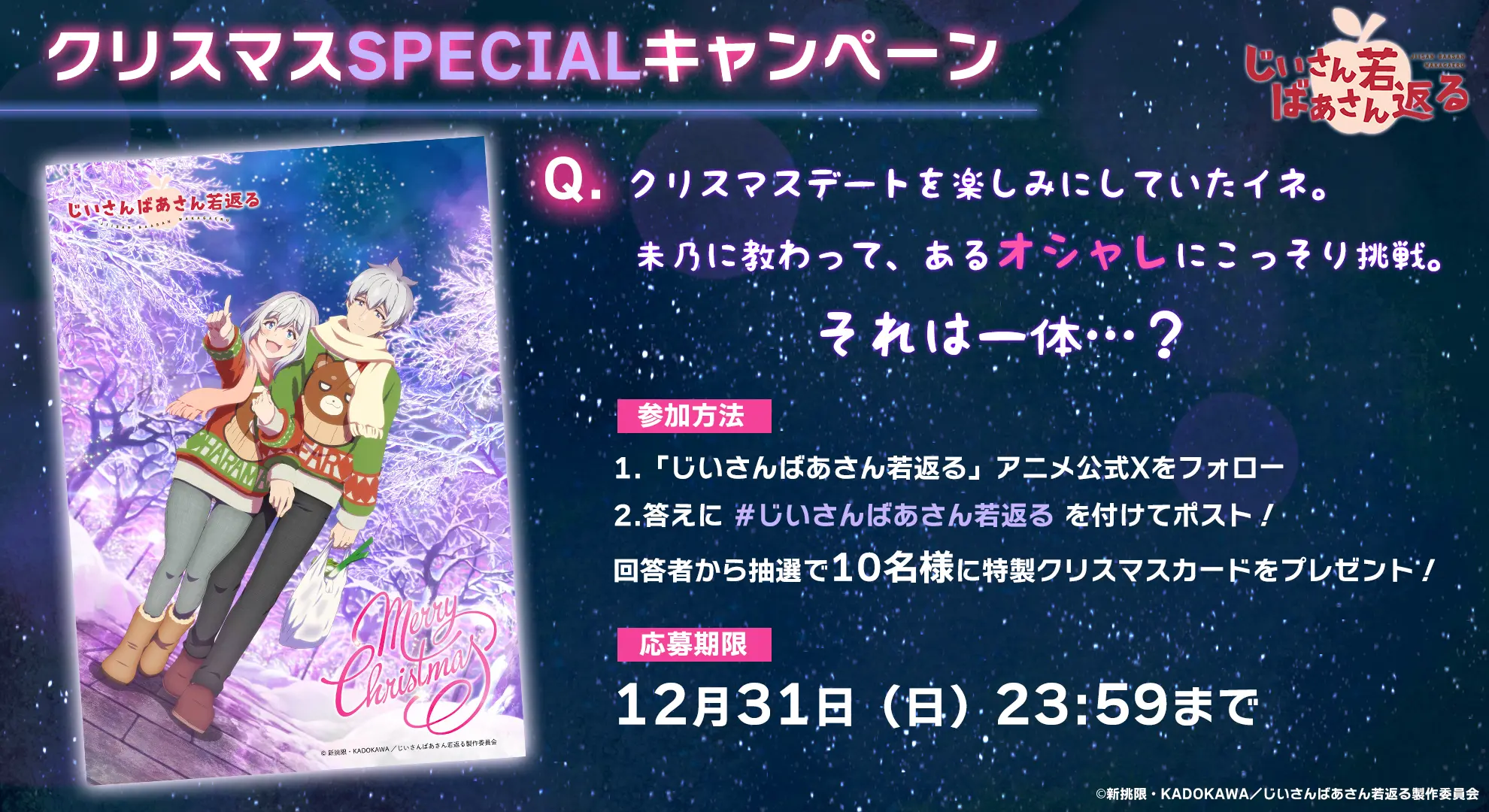 『じいさんばあさん若返る』の第10話放送を記念して、感想投稿キャンペーンを実施! 『じいさんばあさん若返る』TVアニメ公式X(@jisanbasan_prj)をフォロー&感想を「#じいさんばあさん若返る」をつけてツイートすると、抽選でサイン入りポスターを1名様にプレゼント!