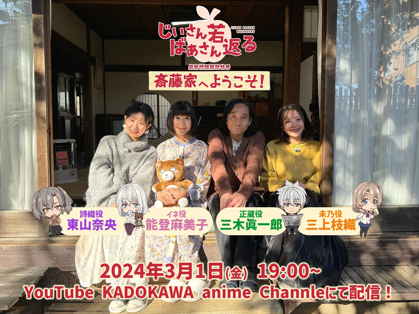 アニメ最新情報をお届けする特別番組「斎藤家へようこそ!」の配信が決定しました!ノスタルジーを感じる一軒の古民家にて、正蔵役・三木眞一郎、イネ役・能登麻美子、未乃役・三上枝織、詩織役・東山奈央、斎藤家の豪華キャスト4名が一堂に会する番組になっております。 じいさんばあさんが暮らす斎藤家へとふらっと遊びに来ていただくようなコンセプトで、楽しいトーク、ゲームコーナー、そしてアニメ最新情報が盛りだくさんにお届けする予定です。 本編映像をいち早くご覧になられたい方はぜひお見逃しなく! 2024年3月1日(金)19:00~ YouTube KADOKAWAanime Channelにて配信予定です。 続報をお楽しみください!