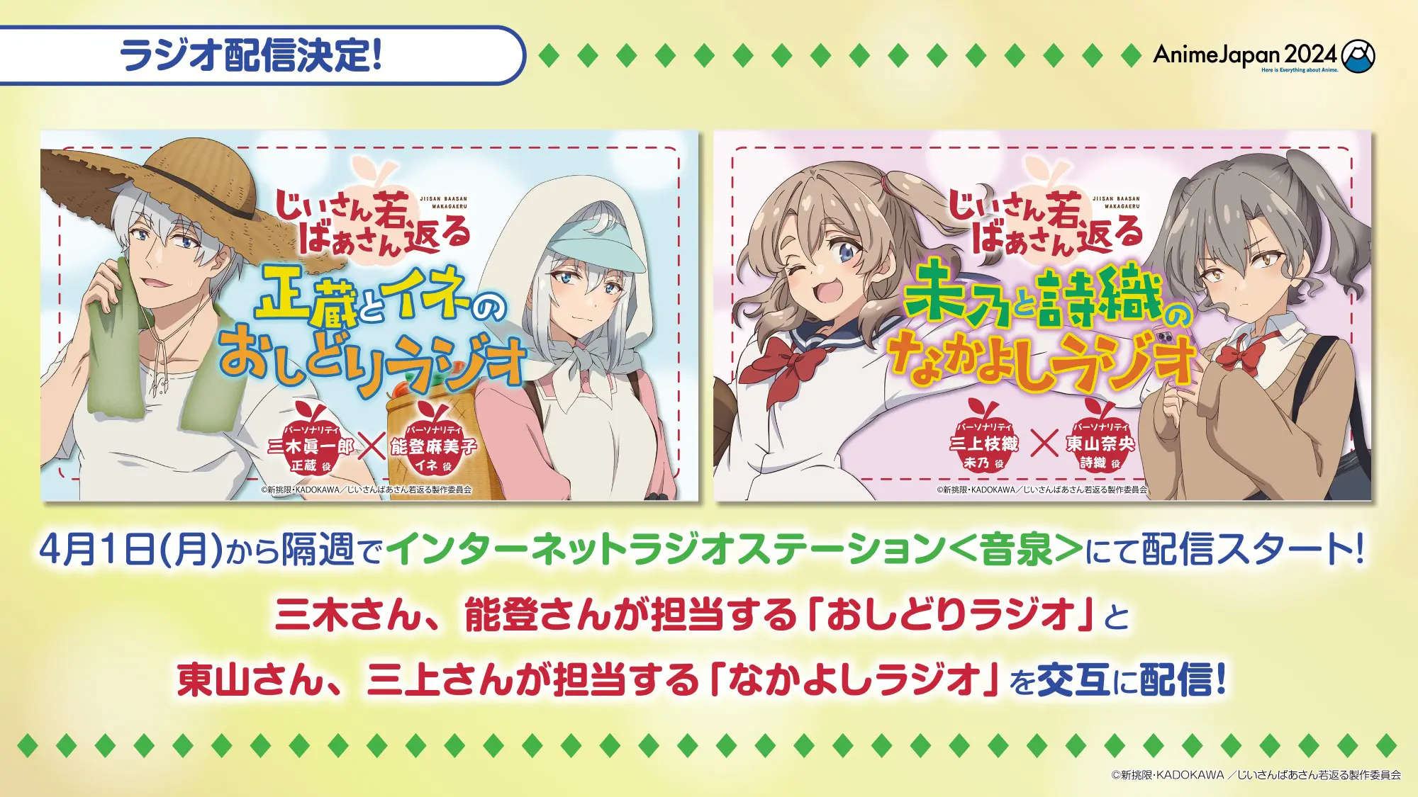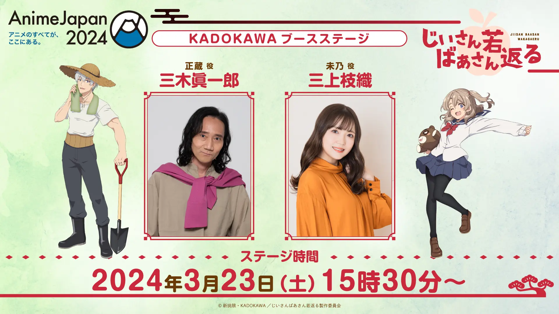 2024年3月23日(土)・24日(日)に開催される『AnimeJapan2024』KADOKAWA ブースにて、TVアニメ『じいさんばあさん若返る』ステージの実施が決定いたしました!