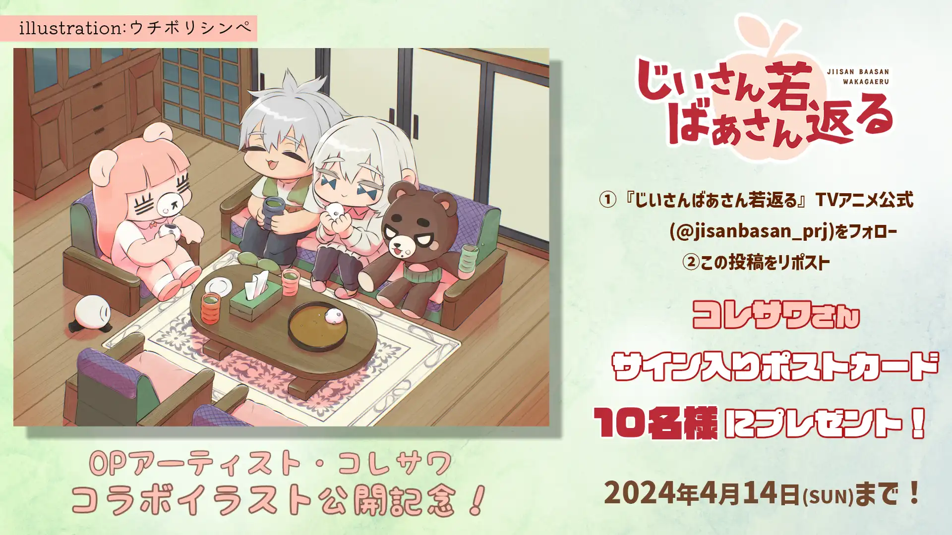 『じいさんばあさん若返る』の第11話放送を記念して、感想投稿キャンペーンを実施! 『じいさんばあさん若返る』TVアニメ公式X(@jisanbasan_prj)をフォロー&感想を「#じいさんばあさん若返る」をつけてツイートすると、抽選でサイン入りポスターを1名様にプレゼント!