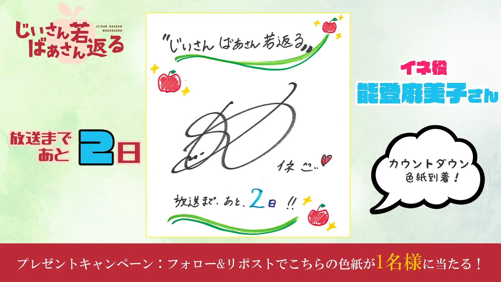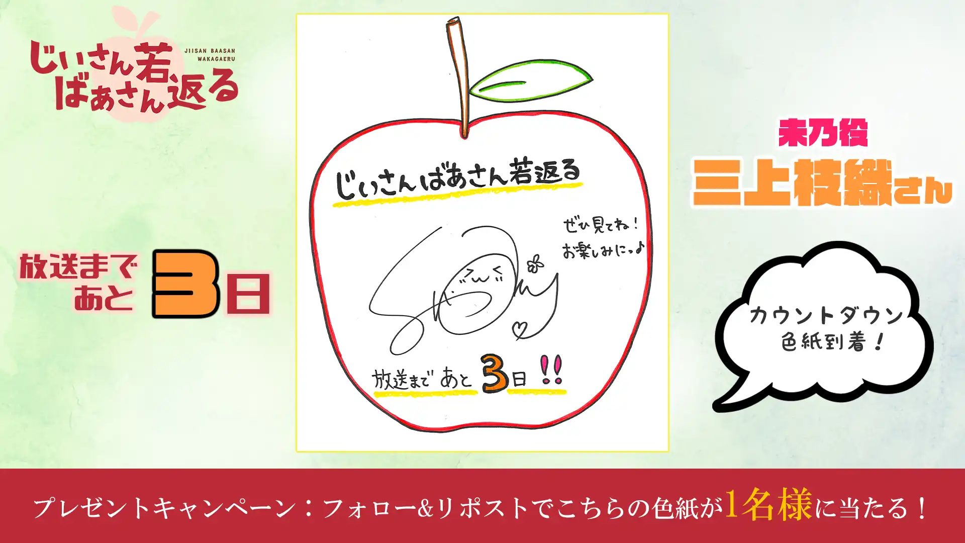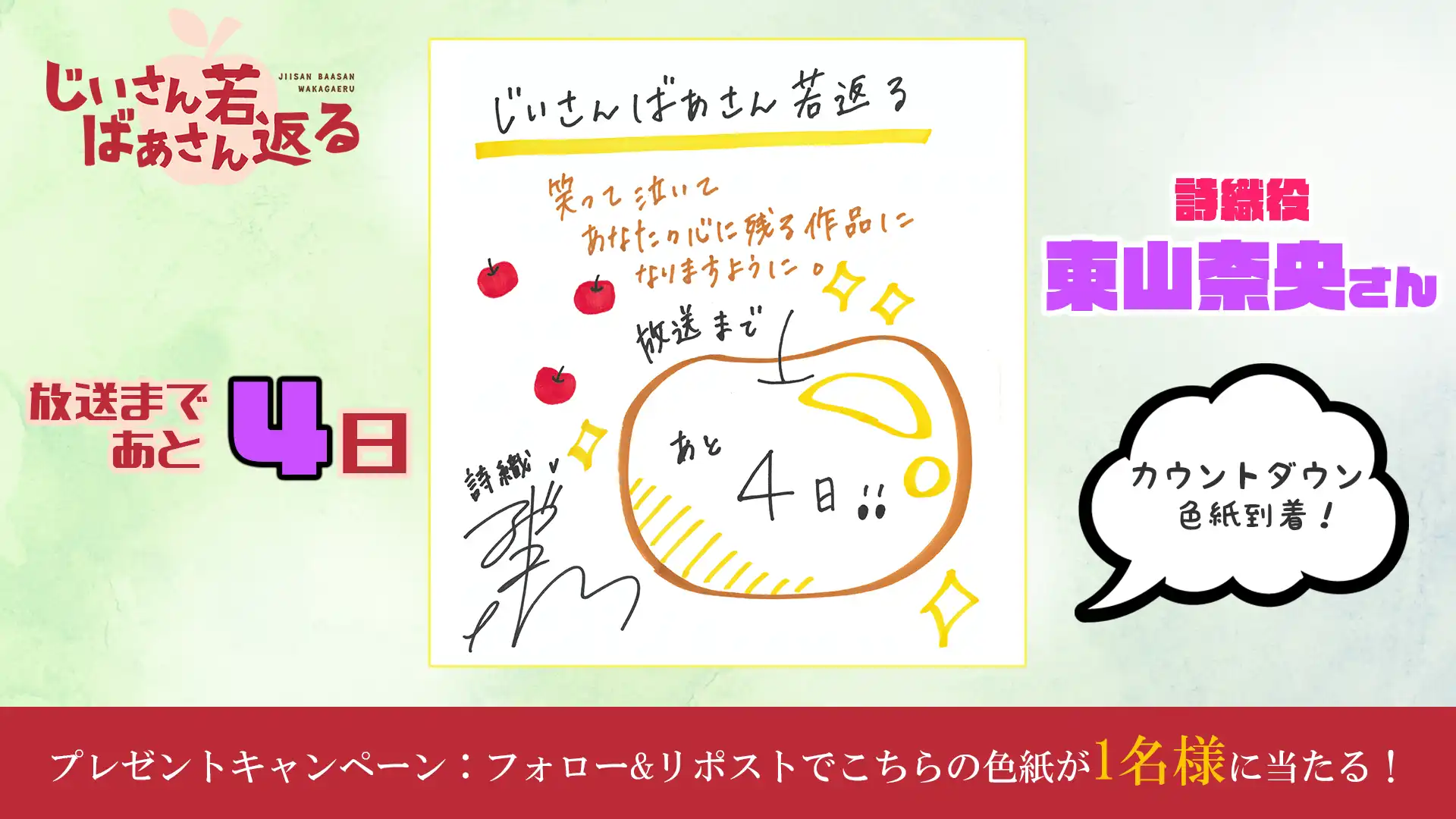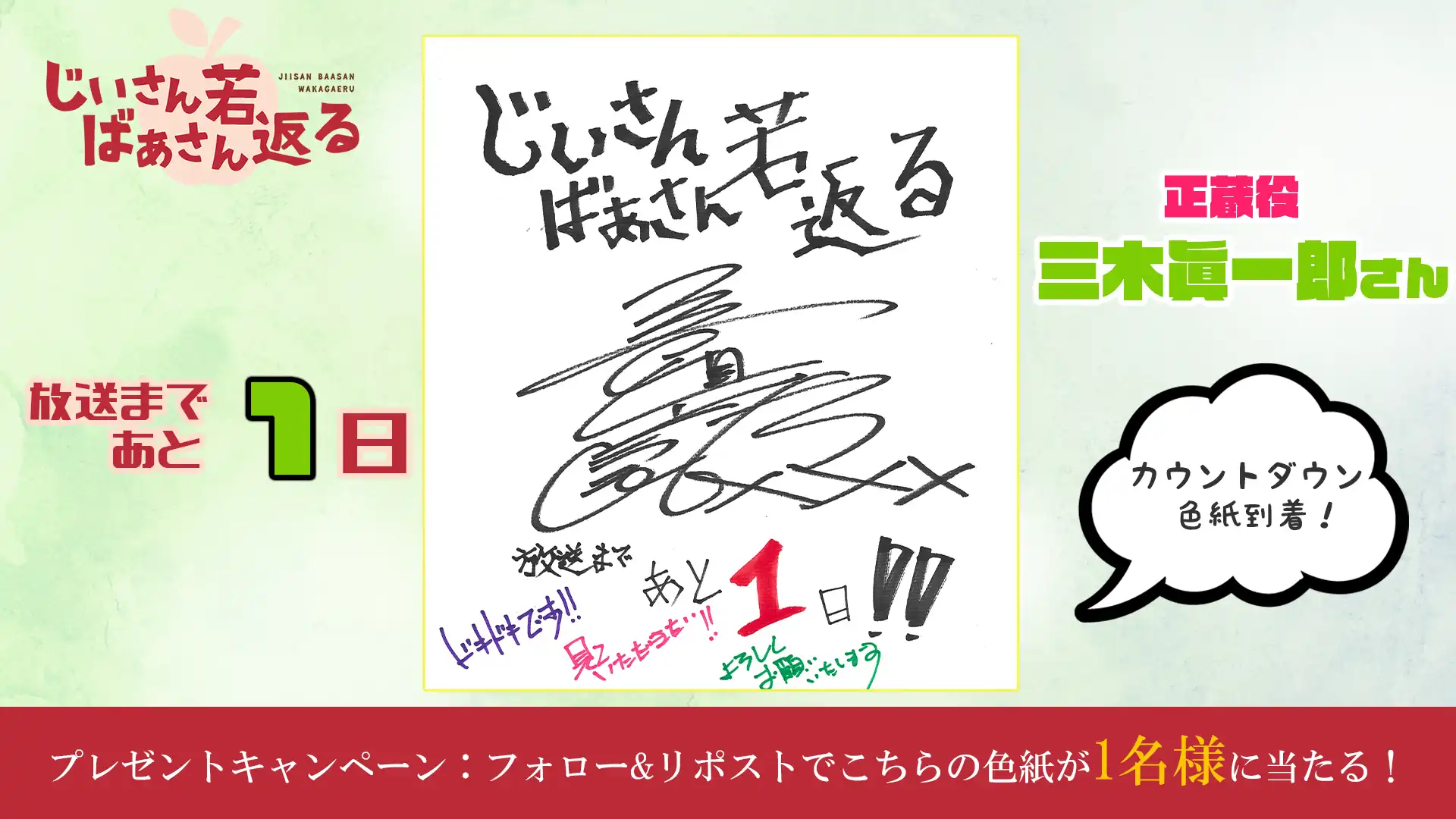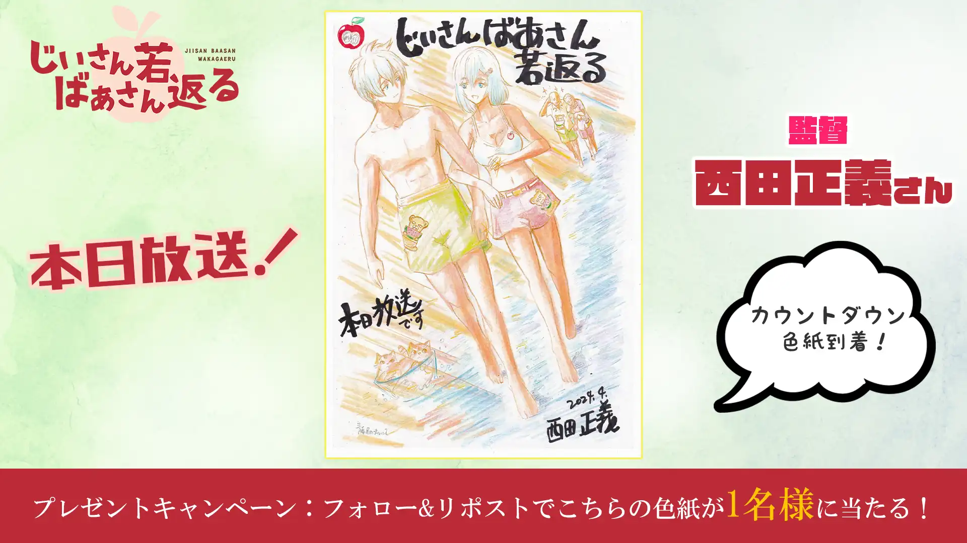 『じいさんばあさん若返る』の第4話放送を記念して、感想投稿キャンペーンを実施! 『じいさんばあさん若返る』TVアニメ公式X(@jisanbasan_prj)をフォロー&感想を「#じいさんばあさん若返る」をつけてツイートすると、抽選でサイン入り台本を1名様にプレゼント!