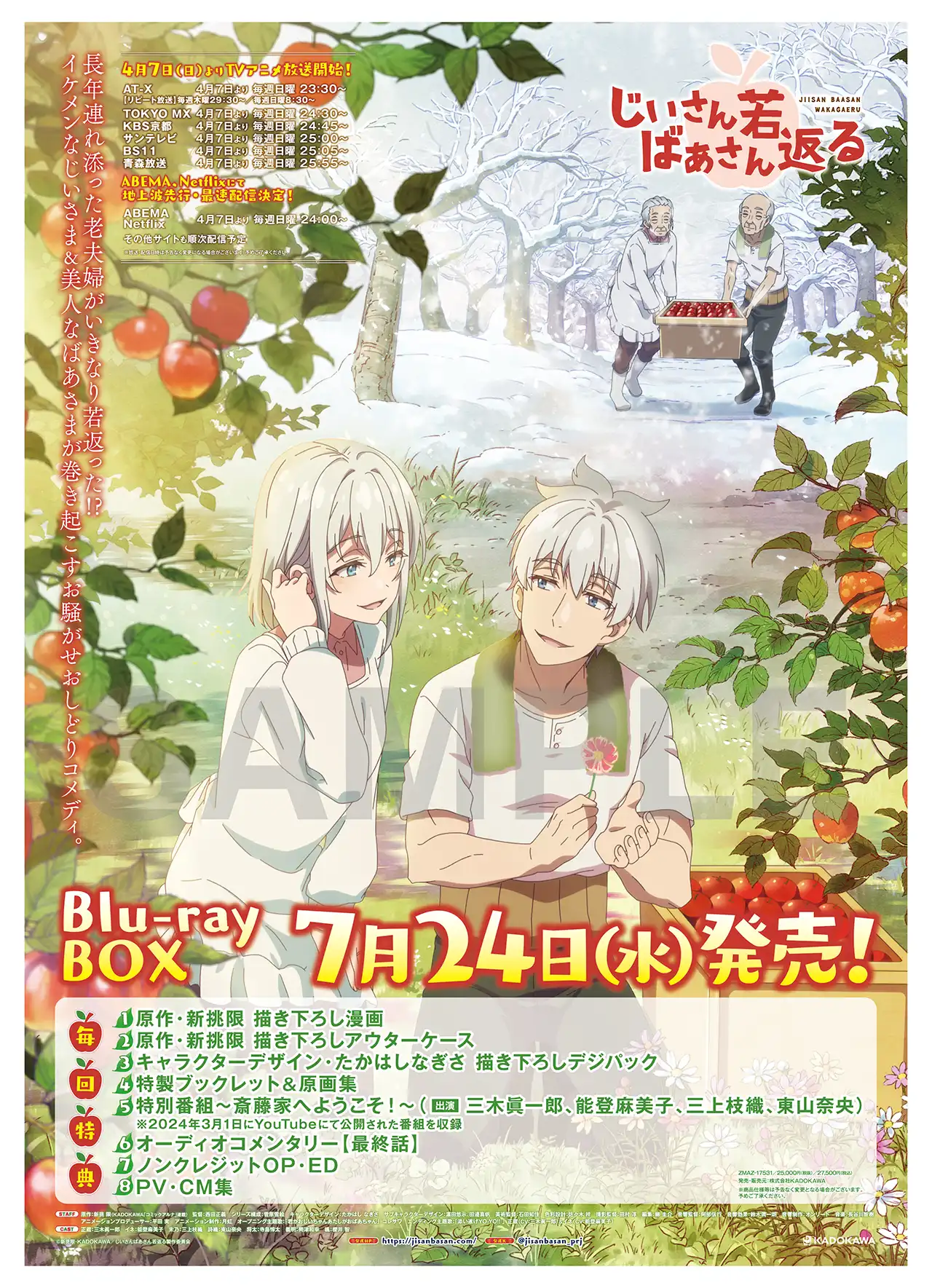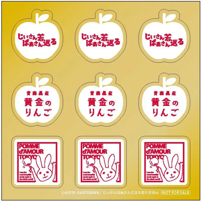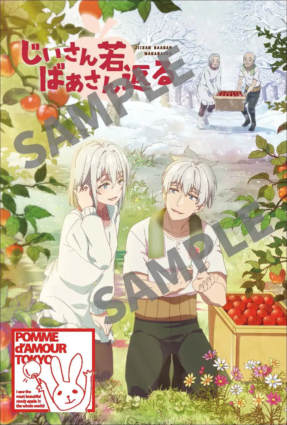 STAFF&CASTTVアニメ『じいさんばあさん若返る』×りんご飴専門店「ポムダムールトーキョー」のスペシャルコラボが決定しました! 『じいさんばあさん若返る』の主人公正蔵とイネは青森でりんご農家を営むじいさんとばあさんである。ある日、金色のりんごを偶然見つけて口にした二人はいきなり体が若返ったという……。その「奇跡の金色のりんご」をイメージしたコラボりんご飴が、4月5日(金)より期間限定でポムダムール各店舗にて販売予定です! 作品の舞台である青森産の希少品種「アンビシャス」を使用して、金色の糖衣と豪華な金箔までふんだんにトッピングされた一品となっております。これを食べると、あなたにも素敵な奇跡が降りかかるかも……!?コラボりんご飴の購入特典として、品種ラベル風オリジナルステッカーも配布予定なので、ぜひチェックしてください!