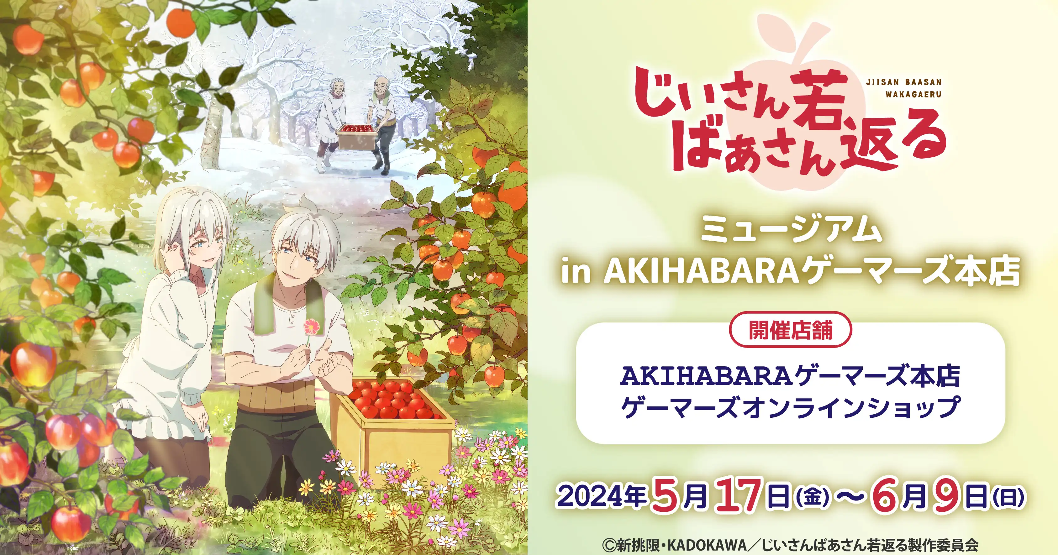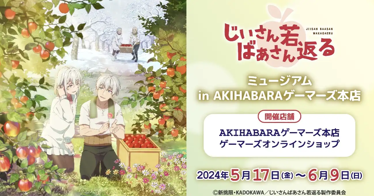 TVアニメ「じいさんばあさん若返る」ミュージアムがAKIHABARAゲーマーズ本店で開催決定! 新作グッズの販売や、ここでしか手に入らない特別な景品をご用意した抽選会を実施! 場面写真パネルなど「じいさんばあさん若返る」の世界に浸れる展示をたくさんご用意して、皆様のご来場をお待ちしております!