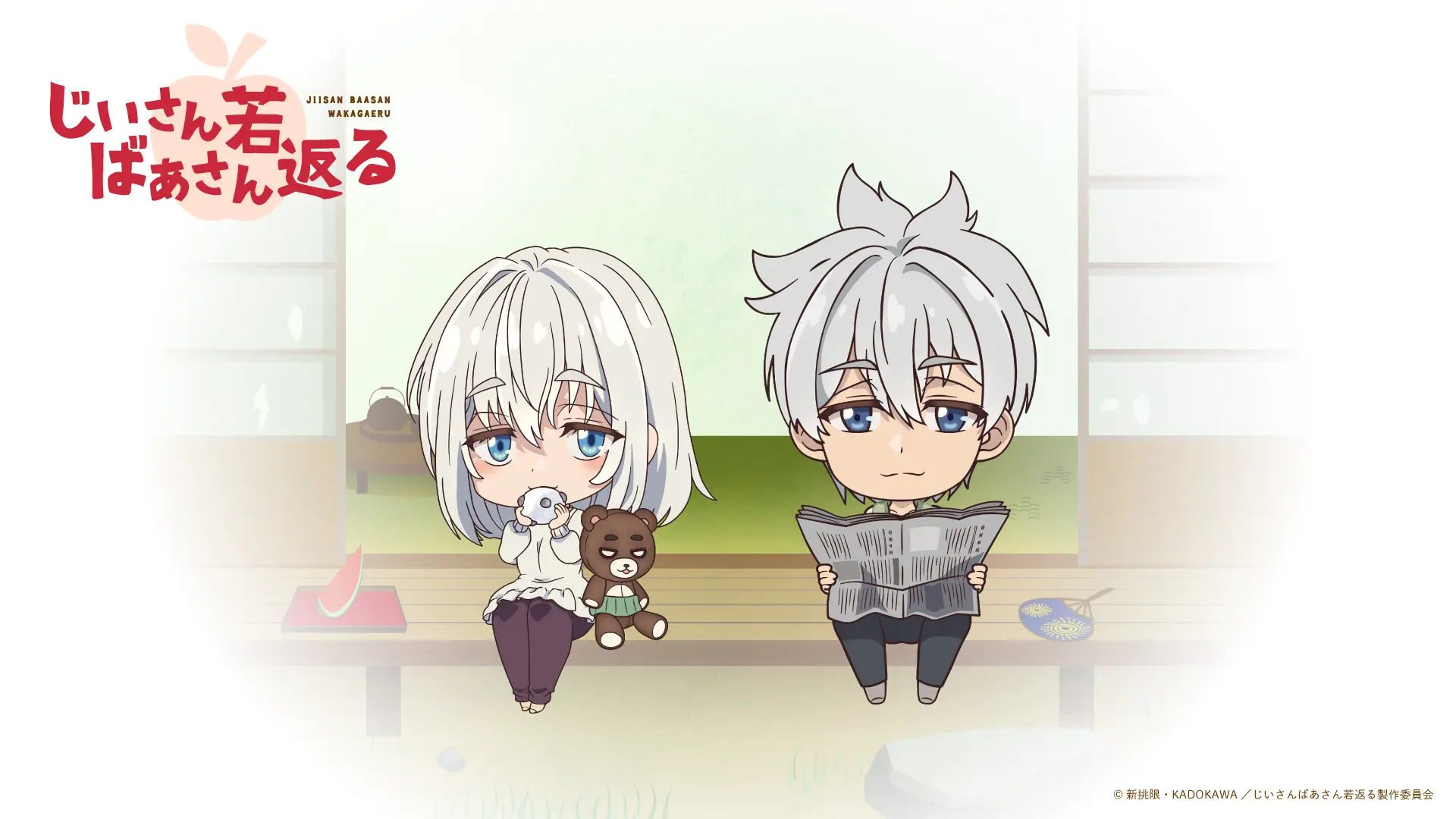 長年連れ添った老夫婦がいきなり若返った!? イケメンなじいさま&美人なばあさまが巻き起こすお騒がせおしどりコメディ、待望のTVアニメ化決定! 青森県のある農村でのんびり暮らしていた高齢夫婦の「正蔵」と「イネ」が若返った姿を描いたティザービジュアル公開! 穏やかにリンゴを剥きながら微笑み合う二人だが、果たしてどんなおしどり老夫婦ラブコメディを見せてくれるのでしょうか? ぜひこれからの作品の展開にご注目ください!